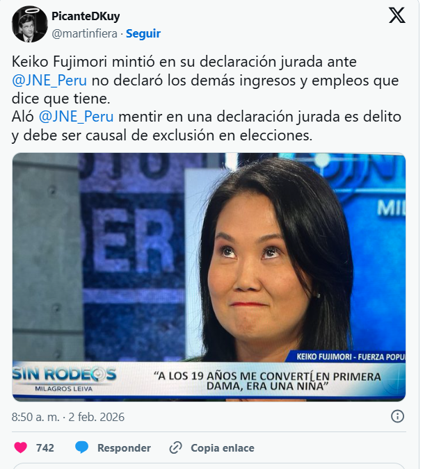 Keiko Fujimori mintió en su declaración jurada ante el JNE no declaró los demás ingresos y empleos que dice que tiene. Mentir en una declaración jurada es delito y debe ser causal de exclusión en elecciones