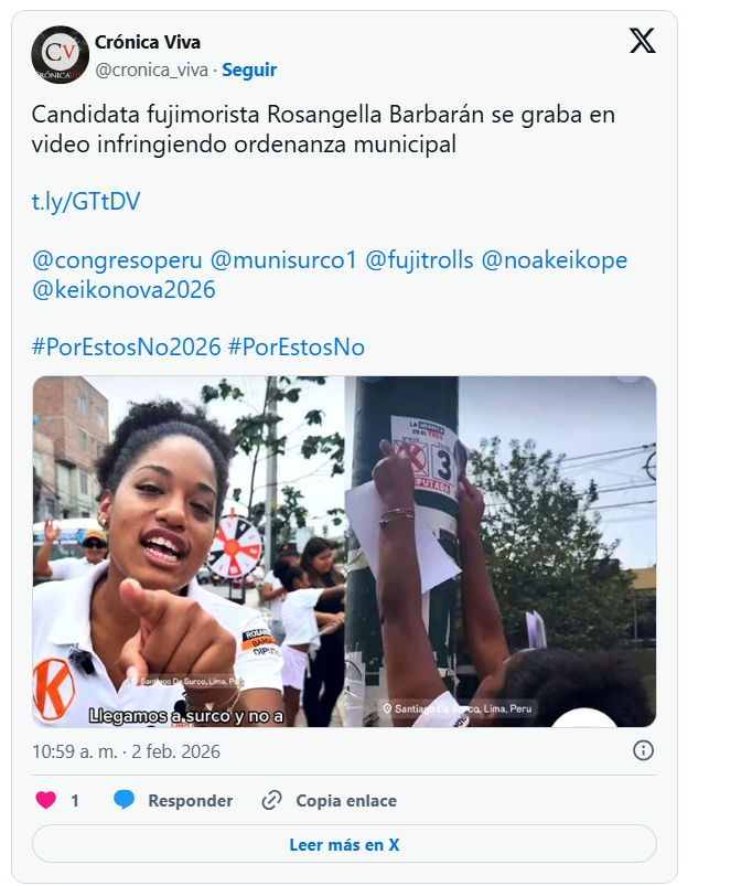 Otra polémica recae sobre la congresista y aspirante a la Cámara de Diputados, Rosangella Barbarán, quien decidió llenar los postes de luz con carteles que destacan su imagen, a pesar de que dicha promoción está claramente prohibida por la normativa electoral.