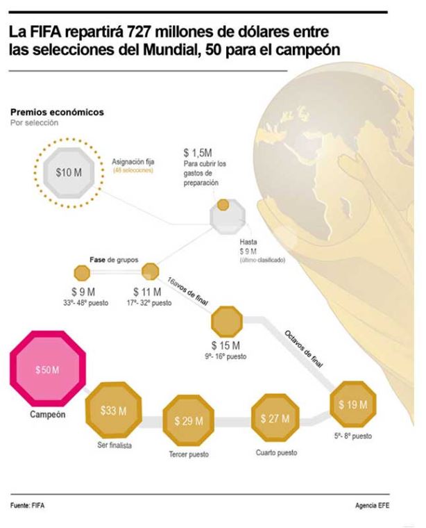 La mayor parte, 655 millones de dólares, se pagará como premio entre los 48 equipos, de forma que el campeón obtendrá 50 millones, el subcampeón 33 millones, el tercero 29 millones y el cuarto 27 millones.