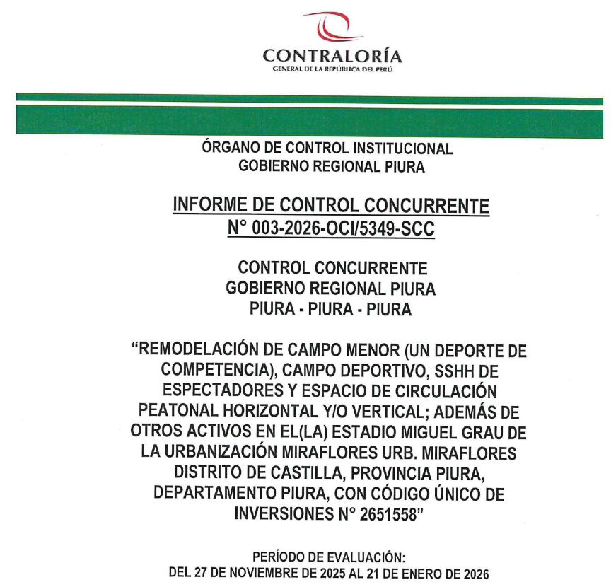 Según el informe de control concurrente N° 003-2026-OCI/5349-SCC denominado “Remodelación de campo menor (un deporte de competencia), campo deportivo, SSHH de espectadores y espacio de circulación peatonal horizontal y/o vertical; además de otros activos en el estadio Miguel Grau de Piura CUI 2651558” derivado de una acción de control simultáneo para la constatación física e inventario de obra de la IOARR. Monto de la materia de control fue S/ 201’641,343.39.