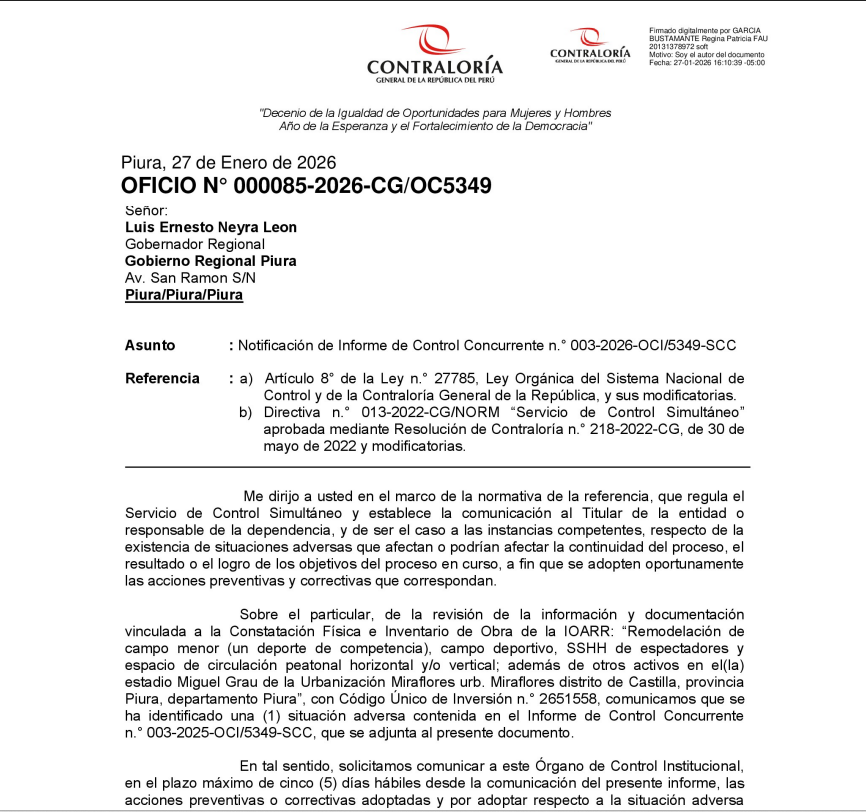 El referido informe emitido el 27 de enero de 2026 auditó el periodo del 27 de noviembre de 2025 al 21 de enero de 2026 ha sido derivado al gobernador regional Luis Neyra León a quien solicita comunicar al OCI GORE Piura las acciones preventivas o correctivas adoptadas y por adoptar respecto a la situación adversa identificada.