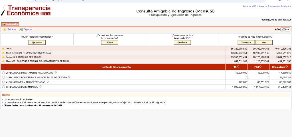 El gobierno regional de Piura (GORE PIURA) que encabeza su titular Luis Neyra León ha recaudado el monto de 434 millones 201 mil 596 Soles de ingresos durante el primer trimestre del año fiscal 2026, según información del ministerio de economía y finanzas (MEF)