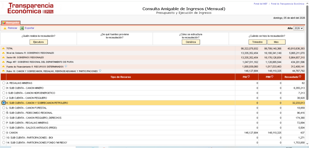 Cabe precisar que, por el recurso canon y sobre canon petrolero (sub cuenta K), al cierre del primer trimestre 2026, el GORE Piura ha recaudado S/ 32’233,013.