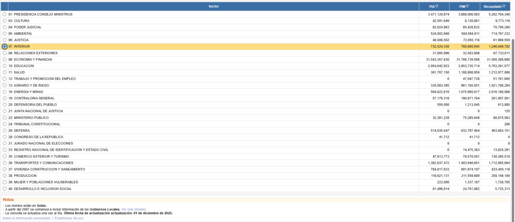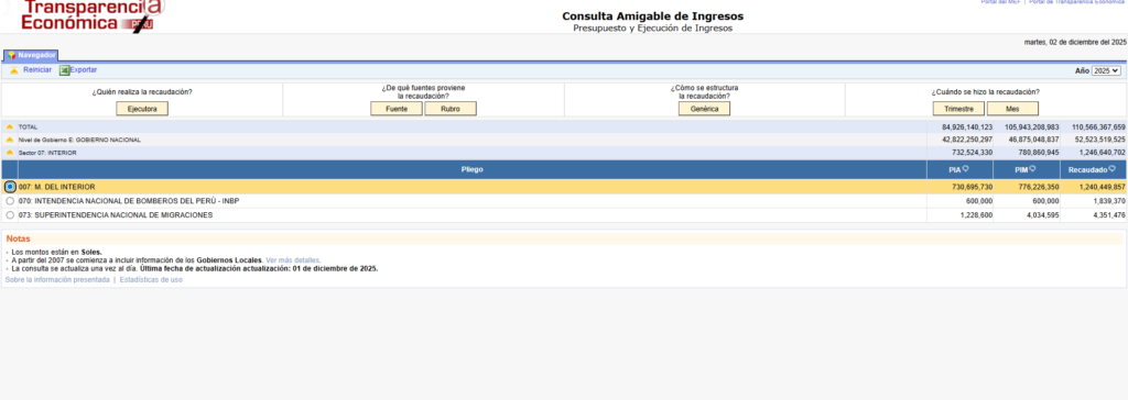 En efecto, según nuestra fuente informativa, el ministerio del interior (pliego 07) ha recaudado 1 mil 246 millones 640 mil 702 Soles que se han distribuido en: S/ 1,240’449,857 para el ministerio del interior pliego 007; S/ 1’839,370 a la intendencia nacional de bomberos del Perú pliego 070; y S/ 4’351,476 para la superintendencia nacional de migraciones pliego 073.