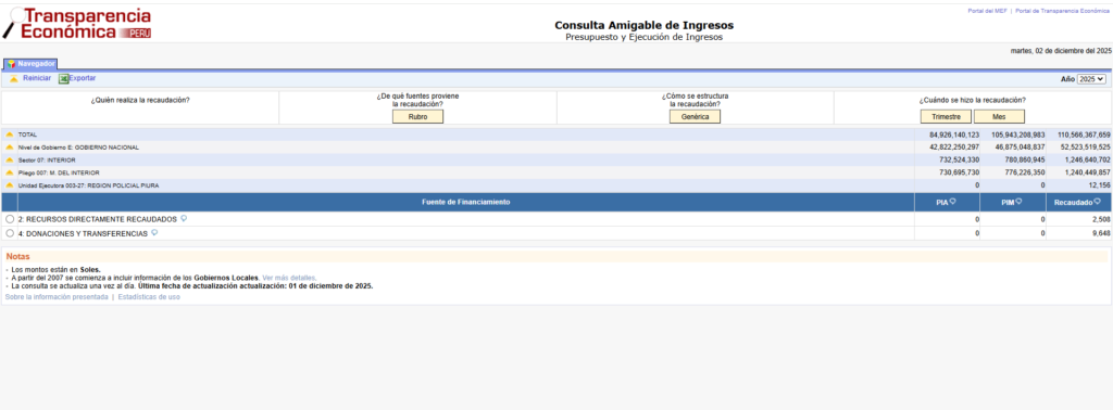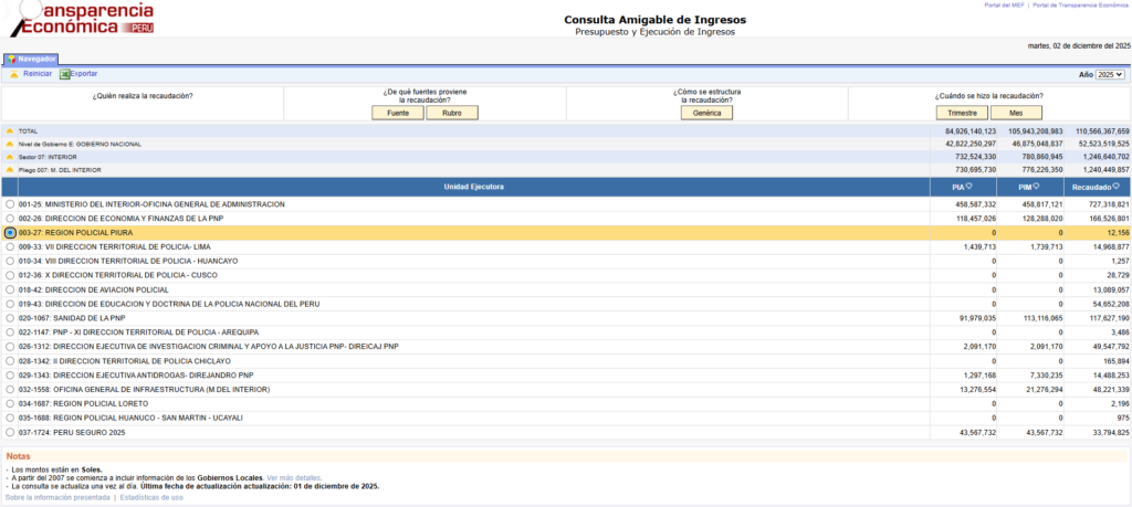 Según la consulta amigable en la plataforma de Transparencia Económica del ministerio de economía y finanzas (MEF), al 30 de noviembre 2025 la región policial Piura (pliego 003-27) ha recibido 12 mil 156 Soles de ingresos del ministerio del interior (Mininter pliego 007).