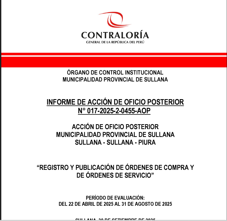 Una comisión de la Contraloría detecto esta situación adversa que ha sido plasmada en el Informe de Acción de Oficio Posterior N° 017-2025-2-0455-AOP emitido con el objetivo de comunicar al titular de la Municipalidad Provincial de Sullana la existencia del hecho con indicios de irregularidad contrario a la normativa que regula las contrataciones públicas, a fin que se adopten las acciones inmediatas que correspondan.