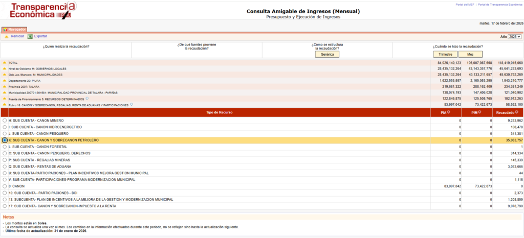El ministerio de economía y finanzas (MEF) ha informado que durante el año 2025 transfirió a la municipalidad provincial de Talara (MPT) 35 millones 083 mil 757 Soles por concepto del recurso canon y sobre canon petrolero, cifra muy inferior a lo que se había estimado para la comuna provincial que era un monto aproximado de 78 millones de Soles.