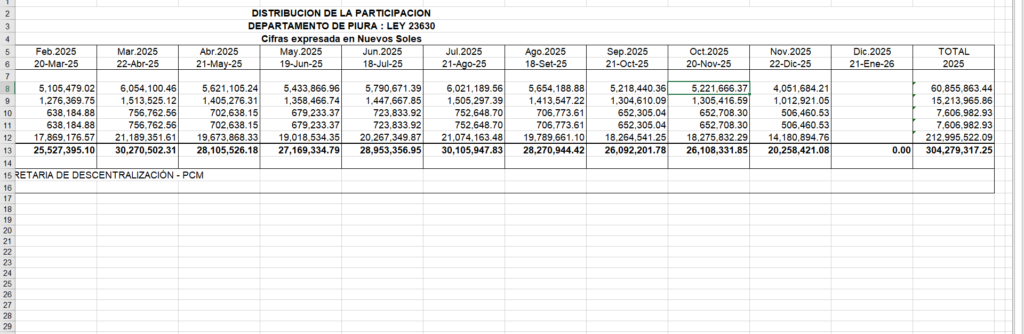 A acuerdo con las estadísticas de Perupetro, agencia que se encarga de la distribución del canon y sobre canon petrolero, de enero a noviembre 2025 distribuyó para las municipalidades del departamento de Piura el monto de 304 millones 279 mil 317 Soles y 25/100. La distribución a los Municipios se realiza a través de la secretaría de descentralización de la presidencia del consejo de ministros (PCM)… Texto: ANDRÉS ABAD TEJADA