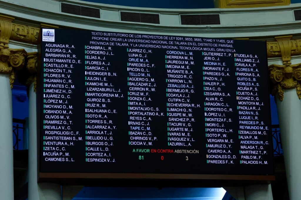 El Pleno del Congreso aprobó esta noche el dictamen recaído en los proyectos de ley 9281, 9655, 9685, 11440 y 11455, que crea la Universidad Nacional de Talara y la Universidad Nacional Tecnológica Miguel Grau de Paita, informó el Centro de Noticias del Congreso de la República.