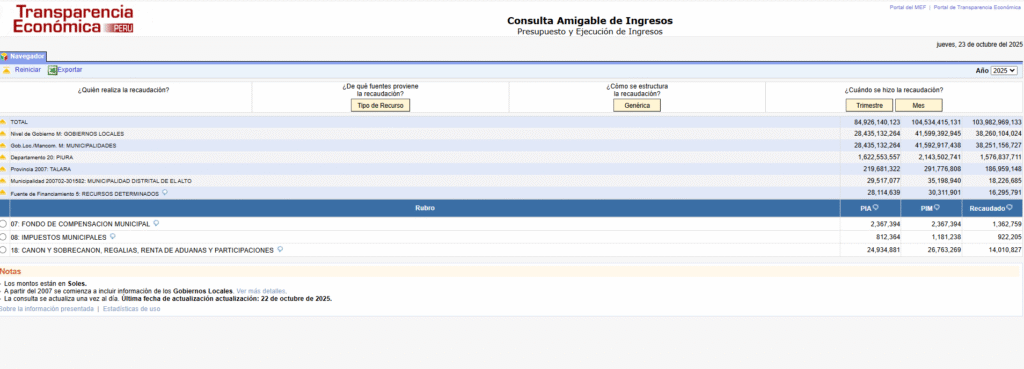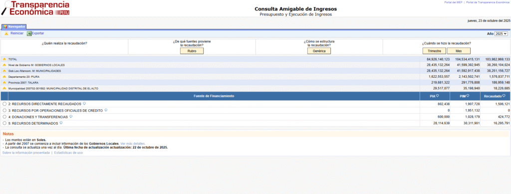 El gobierno local del distrito El Alto (provincia Talara) que encabeza el actual alcalde Reedy Bancayán Palomino, en lo que va del año fiscal 2025 ha recaudado el monto de S/ 18’226,685 de un Presupuesto Institucional Modificado (PIM) de S/ 35’198,940, según información actualizada del ministerio de economía y finanzas (MEF).