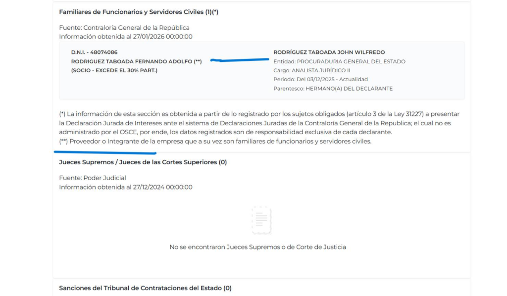 Según la información proporcionada por la Contraloría General de la República actualizada al 27 de enero 2026, RODRIGUEZ TABOADA FERNANDO ADOLFO socio con más del 30% de participación es hermano de RODRÍGUEZ TABOADA JOHN WILFREDO quien se desempeña como analista jurídico II de la Procuraduría del Estado desde el 03 de diciembre 2025 hasta la actualidad.
