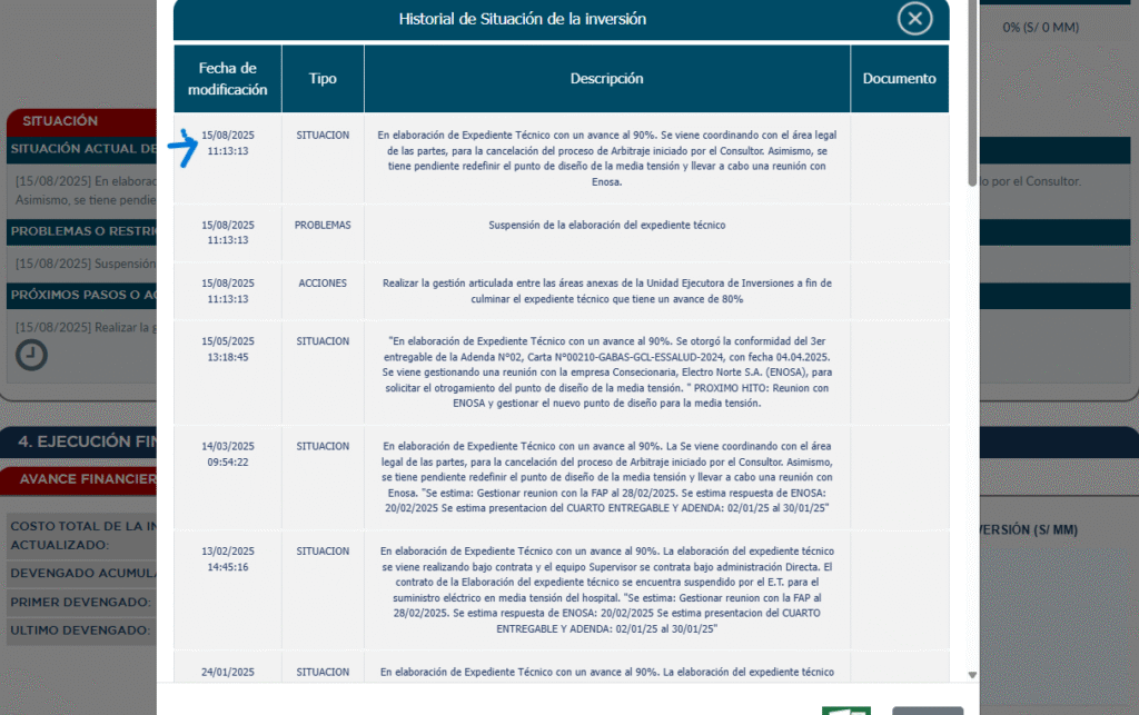 Sin embargo, al 15 de agosto 2025, el MEF informa que la situación de este proyecto de EsSalud se encuentra en elaboración de Expediente Técnico con un avance al 90%. Se viene coordinando con el área legal de las partes, para la cancelación del proceso de Arbitraje iniciado por el Consultor. Asimismo, se tiene pendiente redefinir el punto de diseño de la media tensión y llevar a cabo una reunión con ENOSA.