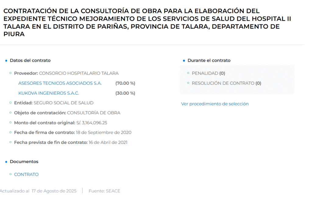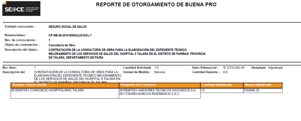 Para seleccionar a consultora que elabore el expediente técnico se convocó la Licitación Pública CP-SM-26-2019-ESSALUD/GCL-1 (05 septiembre 2019) con monto referencial de 3 millones 515 mil 662 Soles y 50/100; en tanto la buena pro se otorgó el 03 de marzo 2020 al Consorcio Hospitalario Talara (RUC 20106987581) conformado por Asesores Técnicos Asociados S.A. (70% de participación) y Kukova Ingenieros S.A.C (30%).