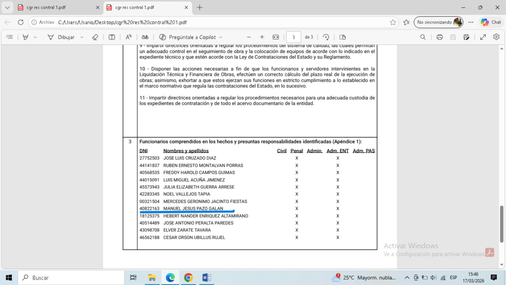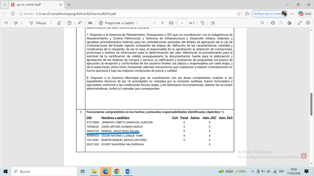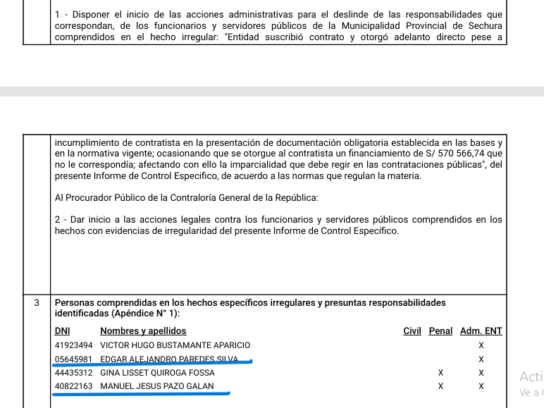 En ese sentido, recomendó al alcalde de Contralmirante Villar inicie las acciones administrativas que correspondan y a la Procuraduría de la CGR inicie las acciones legales contra 12 funcionarios y/o servidores municipales, entre los que se encuentra el actual gerente municipal de Lobitos, Manuel Jesús Pazo Galán.