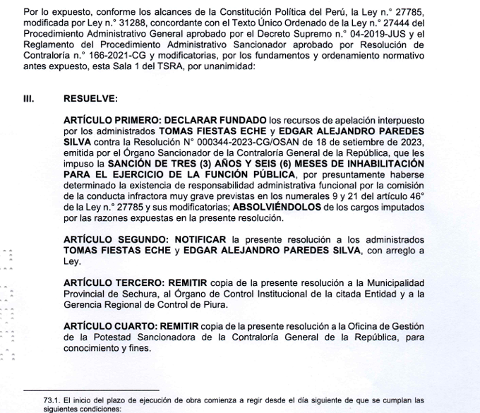 El actual director de desarrollo urbano e infraestructura de la municipalidad distrital de Lobitos, Edgar Alejandro Paredes Silva, con resolución N° 0002-2024-CG/TSRA-SALA 1 del 03 de enero de 2024 fue absuelto de los cargos imputados en la resolución N° 344-2023-CG/OSAN, en el marco de un procedimiento administrativo sancionador.