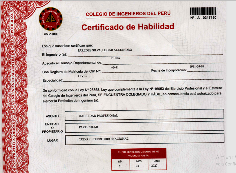 A través de un documento dirigido a esta redacción, el citado servidor municipal, ha aclarado estar habilitado por su gremio acompañando copia del certificado de habilidad del Colegio de Ingenieros del Perú Piura vigente hasta el 31 de marzo de 2027.