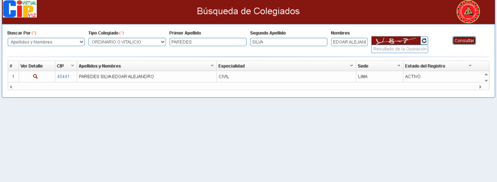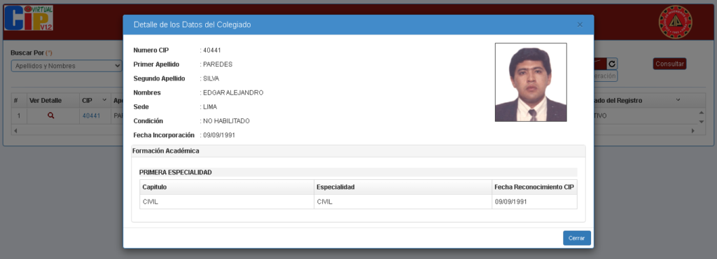 En ese sentido, debemos precisar que una consulta a nuestra fuente inicial, la web del CIP (momentos previos a la presente publicación), informa que el colegiado CIP 40441 Paredes Silva Edgar Alejandro de la sede Lima registra estado activo, condición no habilitado, fecha de incorporación y reconocimiento CIP el 09 septiembre de 1991tal como se observa en la captura de pantalla en esta publicación.