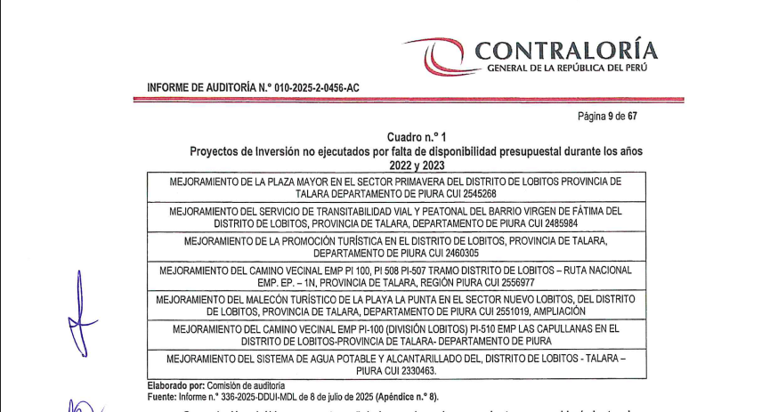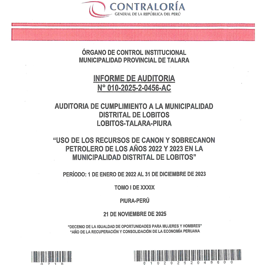 La municipalidad distrital de Lobitos destinó los recursos públicos del canon y sobrecanon petrolero a una finalidad distinta a la establecida en la normativa, al haber pagado gastos corrientes durante los años 2022 y 2023, generando durante dichos periodos una disminución de S/ 3 millones 183 mil 211 Soles con 53/100 en el presupuesto destinado a inversiones de infraestructura de impacto local.