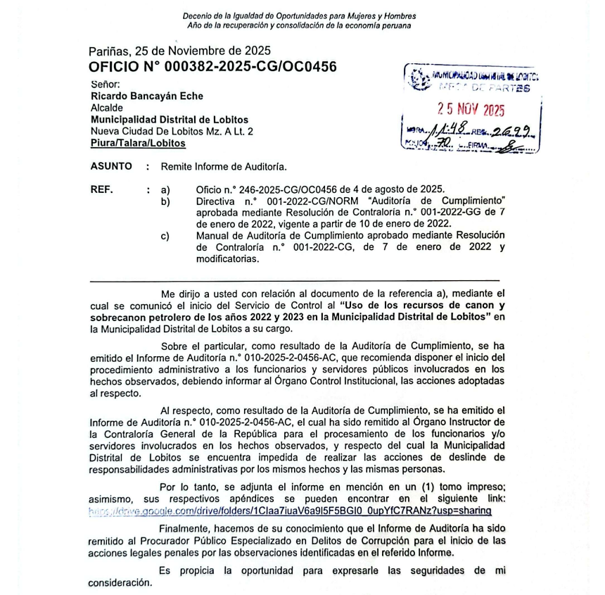 Con oficio N° 000382-2025-CG/OC0456 (27 de noviembre 2025) la Contraloría notificó al actual alcalde Ricardo Bancayán Eche el Informe de Auditoría N° 010-2025-2-0456-AC (67 folios) y le recomienda disponer a las unidades orgánicas que correspondan, la elaboración de lineamientos que aseguren un adecuado control del acervo documentario de las contrataciones por montos iguales o inferiores a ocho (8) UIT, a fin de contribuir a un orden y uniformidad de dicha documentación que permitan contar con información confiable en beneficio de la legalidad y validez de los actos de la administración de la entidad.
