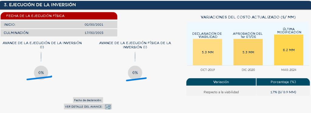 Sin embargo, información del sistema integrado de administración financiera (SIAF) indica que en 2023 esta obra registró un presupuesto de S/ 913,820 de los cuales devengó S/ 696,294 (76.2%), en 2024 un PIM de S/ 3’258,526 devengando S/ 41,000 (1.3%), en 2025 un PIM de S/ 3’747,572 de lo que devengó S/ 427,722 (11.4%) y este 2026 dispone de un presupuesto de S/ 2’863,265 habiendo devengado, al 24 de abril, S/ 1’795,847 (62.7%).