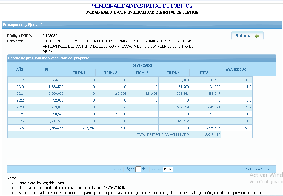 La obra es ejecutada por el consorcio VARADERO conformado por las contratistas MURGISA SERVICIOS GENERALES SRL y CORPORACION HUASCARAN SAC con quienes el gobierno municipal de Lobitos, el 17 de diciembre de 2025, suscribió el contrato 005-2025-MDL-ALC por 4 millones 277 mil 217 Soles y 43/100. Al 17 de abril el proyecto de inversión se encuentra en ejecución, en vía de revisión de la valorización 03… Texto: ANDRÉS ABAD TEJADA – Fuente: MEF / SIAF