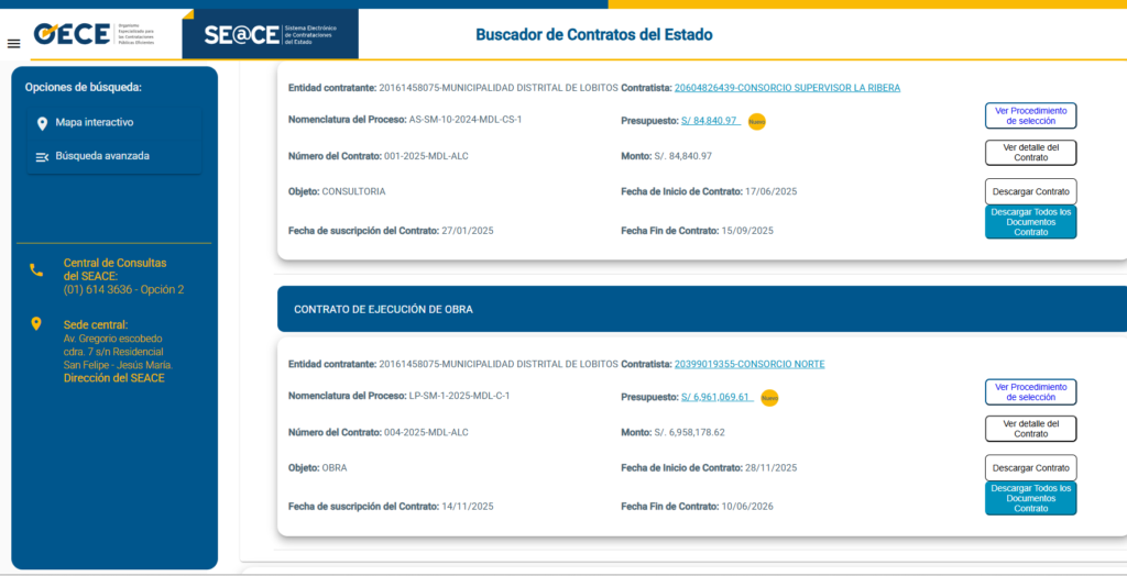En el 2024 firmó contratos de 3 obras, 3 consultorías y 2 servicios por un total de S/ 2’233,535.06; y en el 2025 rubricó 5 contratos de obras, 2 consultorías, 1 servicio y 1 bien por un monto acumulado de S/ 16’865,568.34.