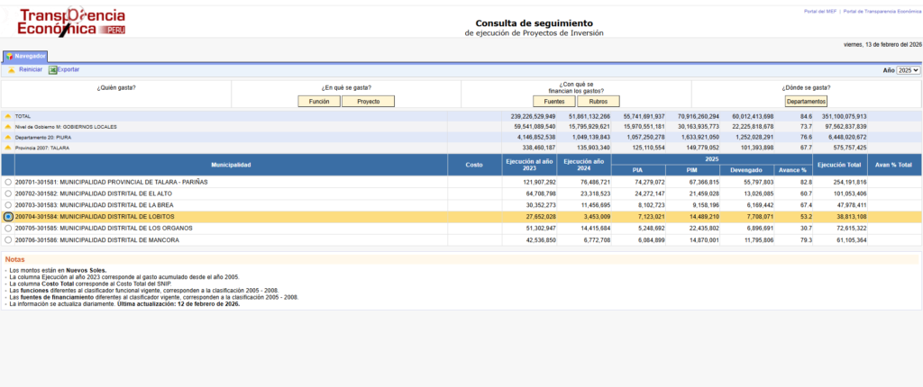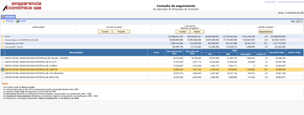 Cabe indicar que, para el año fiscal 2026 la comuna lobiteña ha empezado con un presupuesto institucional modificado (PIM) de S/ 9’078,942 y al 12 de febrero de 2026 registra un devengado de S/ 1’184,602 que significa un avance presupuestal de 13%.