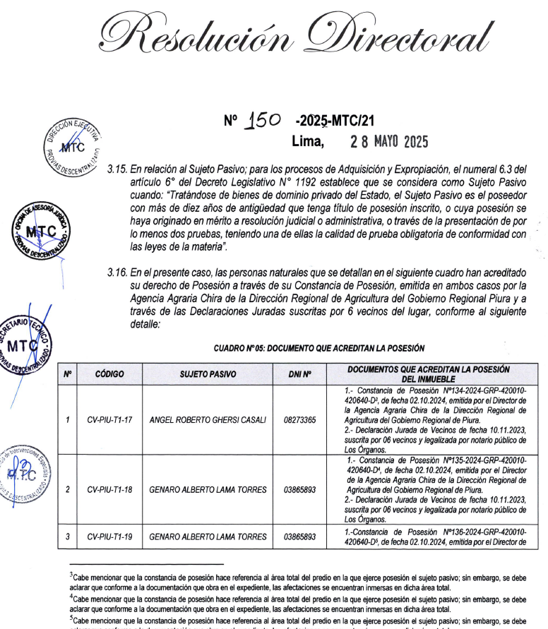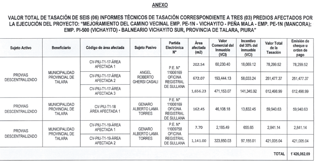 Según la Resolución Directoral N° 150-2025-MTC/21 (Lima, 28 mayo 2025) el Proyecto Especial de Infraestructura de Transporte Descentralizado – Provías Descentralizado adquirió, a los ciudadanos Ángel Roberto Ghersi Casali y Genaro Alberto Lama Torres, 3 predios por el monto acumulado de 1 millón 426 mil 062 Soles y 69/100 para la ejecución del proyecto Mejoramiento del camino vecinal EMP- PE-1N-Vichayito-Peña Mala-EMP. PE-1N(Máncora); EMP. PI-500 (Vichayito)-Balneario Vichayito Sur (distrito de Los Órganos), provincia Talara.