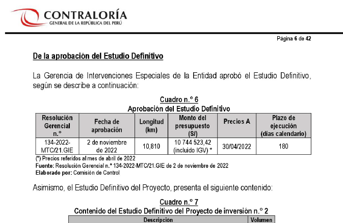 Además, la CGR también precisa que el estudio definitivo del proyecto fue aprobado por la gerencia de intervenciones especiales de Provías descentralizado con resolución N° 134-2022-MTC/21.GIE del 02 noviembre 2022 (es decir, mucho antes que se otorgue la constancia de posesión a los vendedores), por el monto de S/ 10’744,523.42 con precios al 30 abril 2022.