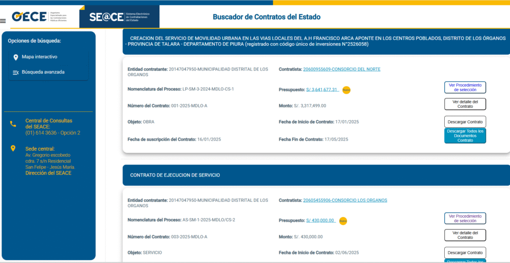 Posteriormente, el 30 de mayo el alcalde Garrido Castro suscribió el contrato N° 003-2025-MDLO-A (inicio 02 de junio y término 30 de setiembre de 2025), por el monto de 430 mil Soles por el servicio de perforación de pozo tubular exploratorio de agua, para el consumo humano. El contrato fue firmado con consorcio Los Órganos (RUC 20605455906) que se hizo de la buena pro de la adjudicación simplificada AS-SM-1-2025-MDLO/CS-2 convocado el 06 de mayo de 2025, según el SEACE.