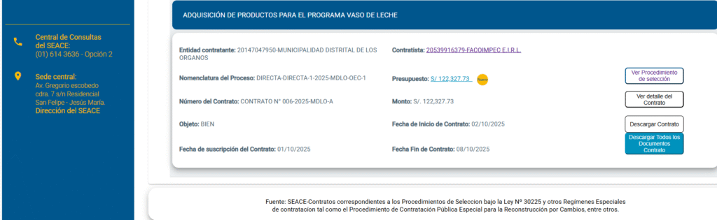 Finalmente, el 01 de octubre 2025 se firmó el contrato N° 006-2025-MDLO-A (inicio 02 de octubre y término 08 de octubre de 2025) por el monto de S/ 122,327.73 por la adquisición de productos para el programa de vaso de leche de la municipalidad distrital de Los Órganos.