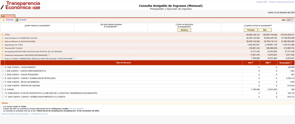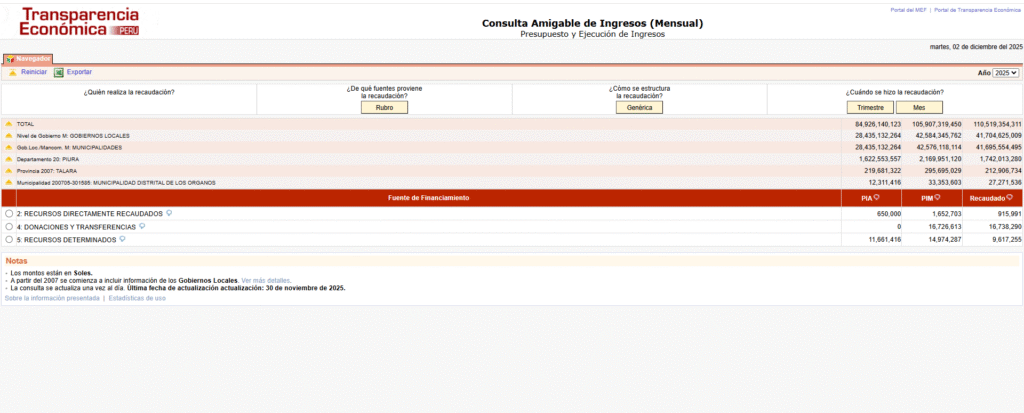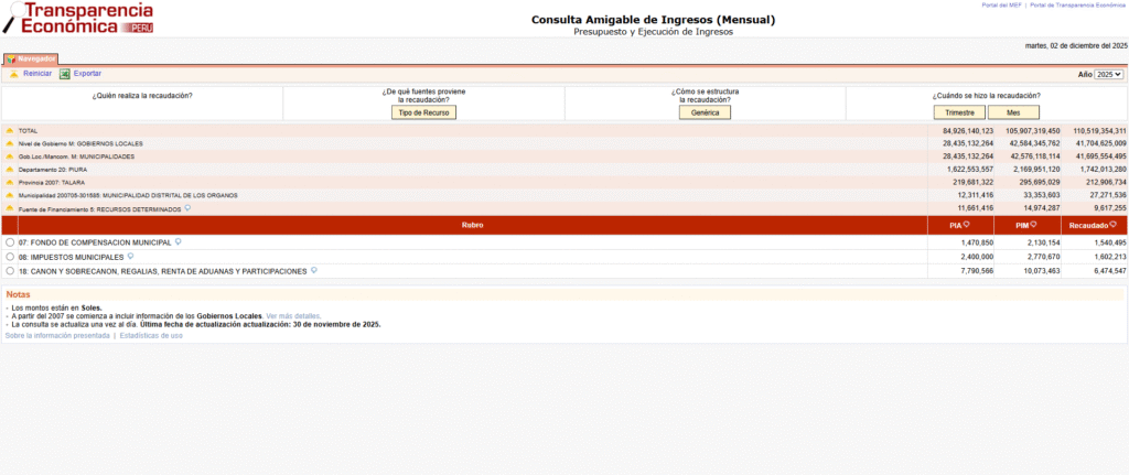 La actual gestión municipal del distrito de Los Órganos que encabeza el alcalde Manuel Garrido Castro, al 30 de noviembre 2025, ha recaudado 27 millones 271 mil 536 Soles que han ingresado a las arcas municipales, según información del ministerio de economía y finanzas – MEF.