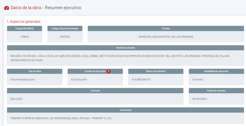 La obra de rehabilitación del local escolar de la IE 14915 que ejecuta el gobierno distrital de Los Órganos que encabeza el alcalde Manuel Helmer Garrido Castro continúa paralizada desde septiembre de 2024 registrando un avance físico de 61.4%, según el Sistema de Información de Obras Públicas (Infobras) de la Contraloría General, plataforma en la que tiene código 173843.