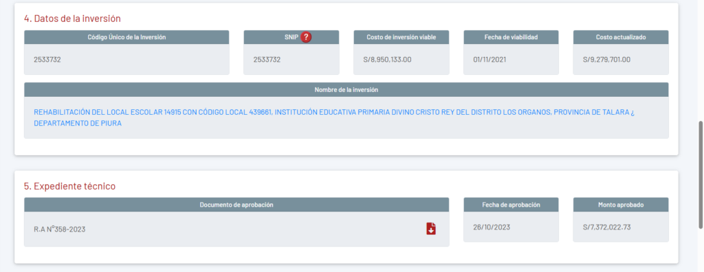Otros datos interesantes de Infobras son que, el costo de inversión viable aprobado el 01 de noviembre de 2021 fue S/ 8’950,133.00 y el costo actualizado alcanza los S/ 9’279,701.00. El expediente técnico fue aprobado el 26 de octubre de 2023, con resolución de alcaldía R.A N° 358-2023, por el monto de S/ 7’372,022.73.