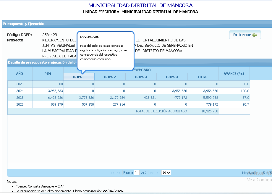 Este proyecto de inversión registrado en el banco de inversiones del MEF con código único 2534428 ha sido ejecutado por consorcio Seguridad Máncora conformado por Segurcity SAC y Financiera Efectiva.
