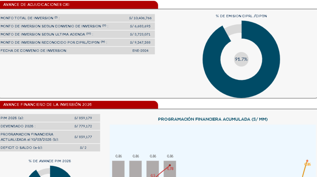 Según el más reciente reporte de seguimiento a la ejecución de inversiones públicas del ministerio de economía y finanzas – MEF, este proyecto que fue declarado viable el 12 de noviembre de 2021 por 6 millones 683 mil 695 Soles y 10/100 registra un costo total de inversión actualizado de S/ 10’406,766.