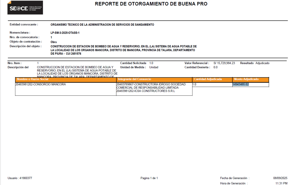 Su ejecución está a cargo del consorcio Máncora RUC 20483981202 conformado por constructora Idrogo SCRL RUC 20483789867 e Icsa constructores SRL RUC 20483981202 que se hicieron de la buena pro de la licitación pública LP-SM-3-2025-OTASS-1 por monto adjudicado de S/ 14’943,485.02.