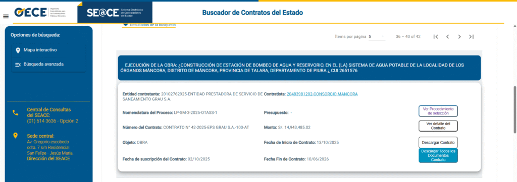 Hay que indicar que el 02 de octubre pasado se suscribió el contrato N° 42-2025-EPS GRAU S.A.-100-AT por monto inicial de S/ 14’943,485.02, vigente desde el 13 de octubre 2025 hasta el 10 de junio de 2026.