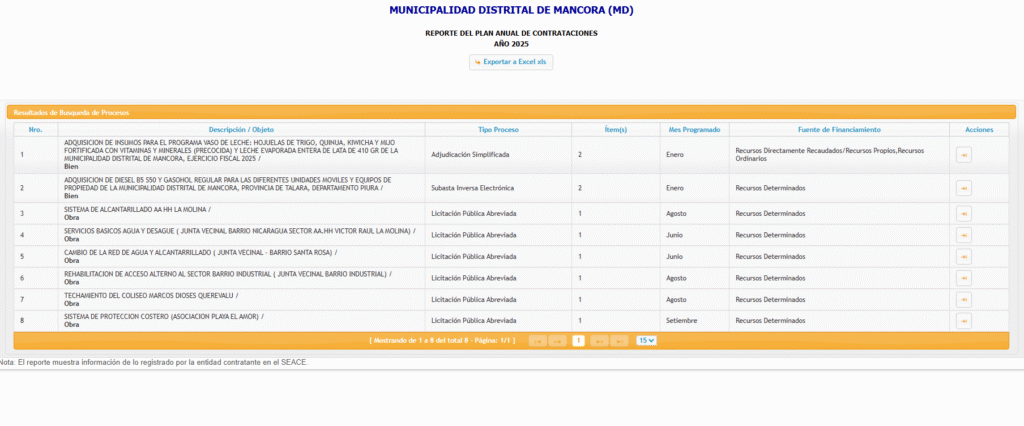 El Plan Anual de Contrataciones – PAC de la municipalidad distrital de Máncora, actualmente gobernada por el alcalde Manuel Cruz Aguilar, ha considerado 8 procesos de contratación para el año fiscal 2025 de los cuales, a la fecha, se han realizado solo 4, según información pública del sistema electrónico de adjudicaciones y contrataciones del Estado (SEACE-OECE).