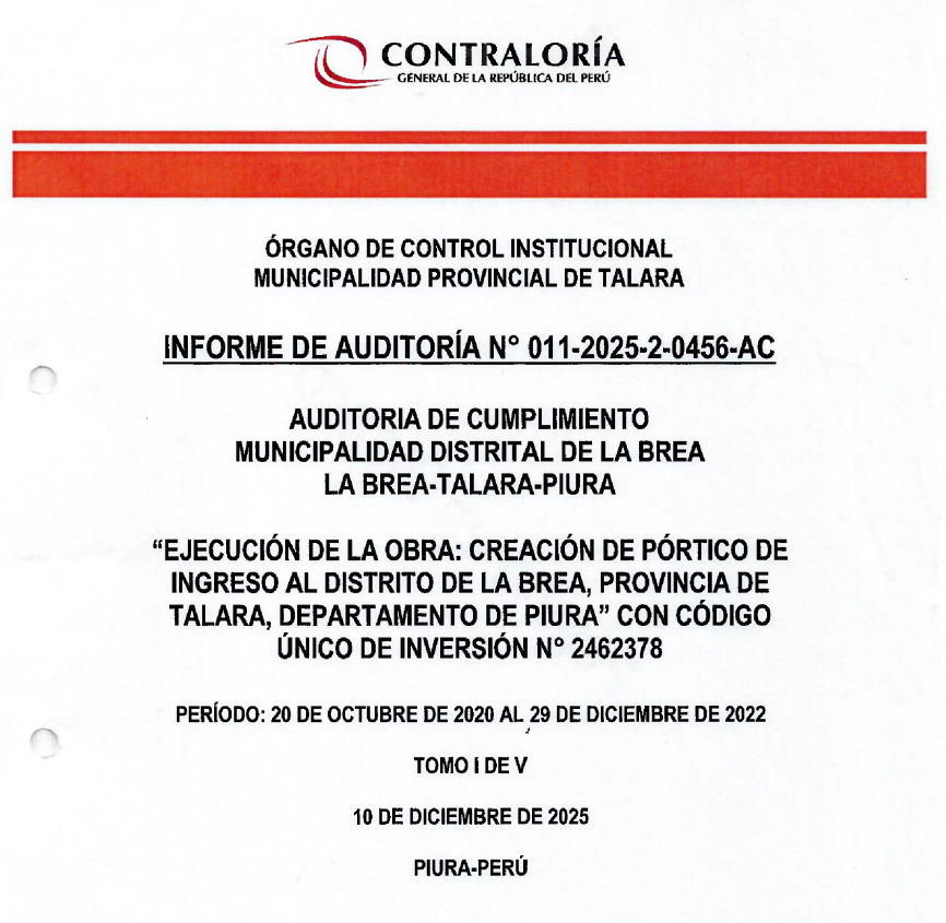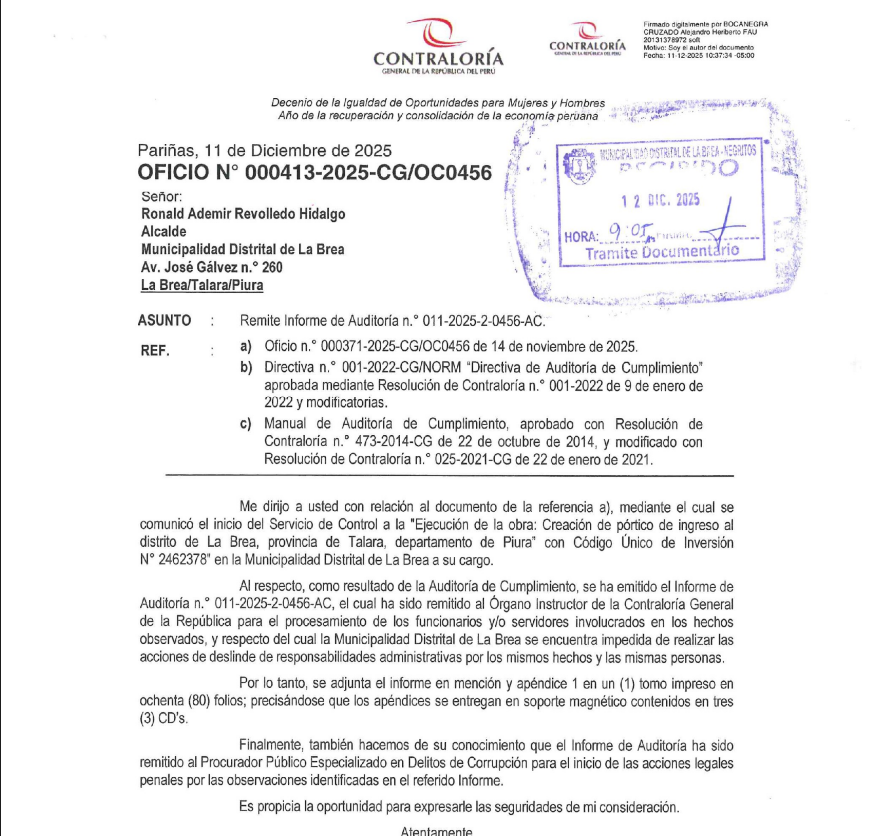 Con oficio 0413-2025-CG/OC0456 (11 diciembre 2025) el alcalde Ronald Revolledo Hidalgo fue notificado y se le remitió el Informe de Auditoría N° 011-2025-2-0456-AC denominado “Ejecución de la obra Creación de pórtico de ingreso al distrito de La Brea”.