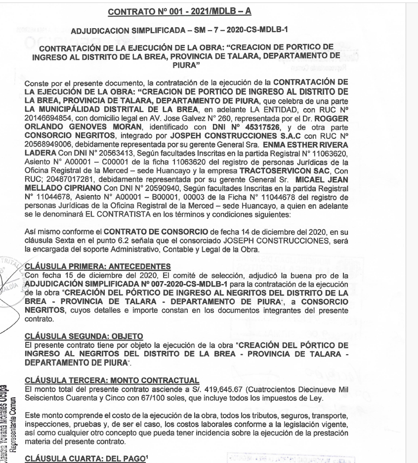 La ejecución de la obra “creación del pórtico de ingreso a Negritos, distrito de La Brea CUI 2462378 se realizó durante el gobierno del ex alcalde Roger Genovés Morán con una inversión inicial adjudicada de S/ 419,645.67 por el cual el entonces alcalde Genovés Morán el 05 de enero de 2021 firmó el contrato N° 001-2021/MDLB-A.
