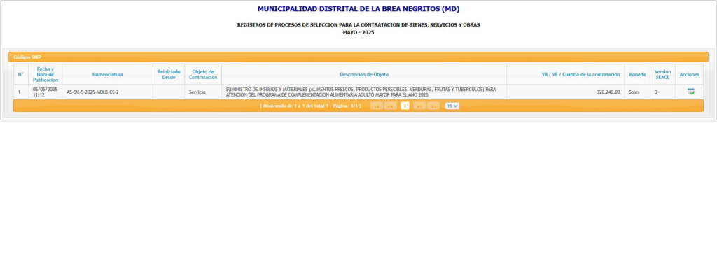 En ese sentido hay que precisar que durante el año 2025 la MDLB convocó solo 5 procedimientos públicos de selección: 1 en febrero (obra), 1 en marzo (obra), 2 en abril (1 obra y 1 bien) y 1 en mayo (obra); por monto total de S/ 4’464,006.88.
