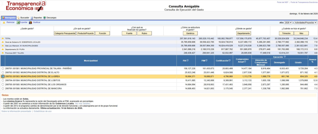 Para este año 2026 la MDLB registra un Presupuesto Institucional Modificado de S/ 16’688,871 de lo que, al 14 de febrero, ha gastado S/ 661,748 (4%) en tanto que, para proyectos de inversión (obras) cuenta con S/ 6’713,903 de los que a la fecha no ha invertido 1 Sol (0%), según el ministerio de economía y finanzas… Texto: ANDRÉS ABAD TEJADA