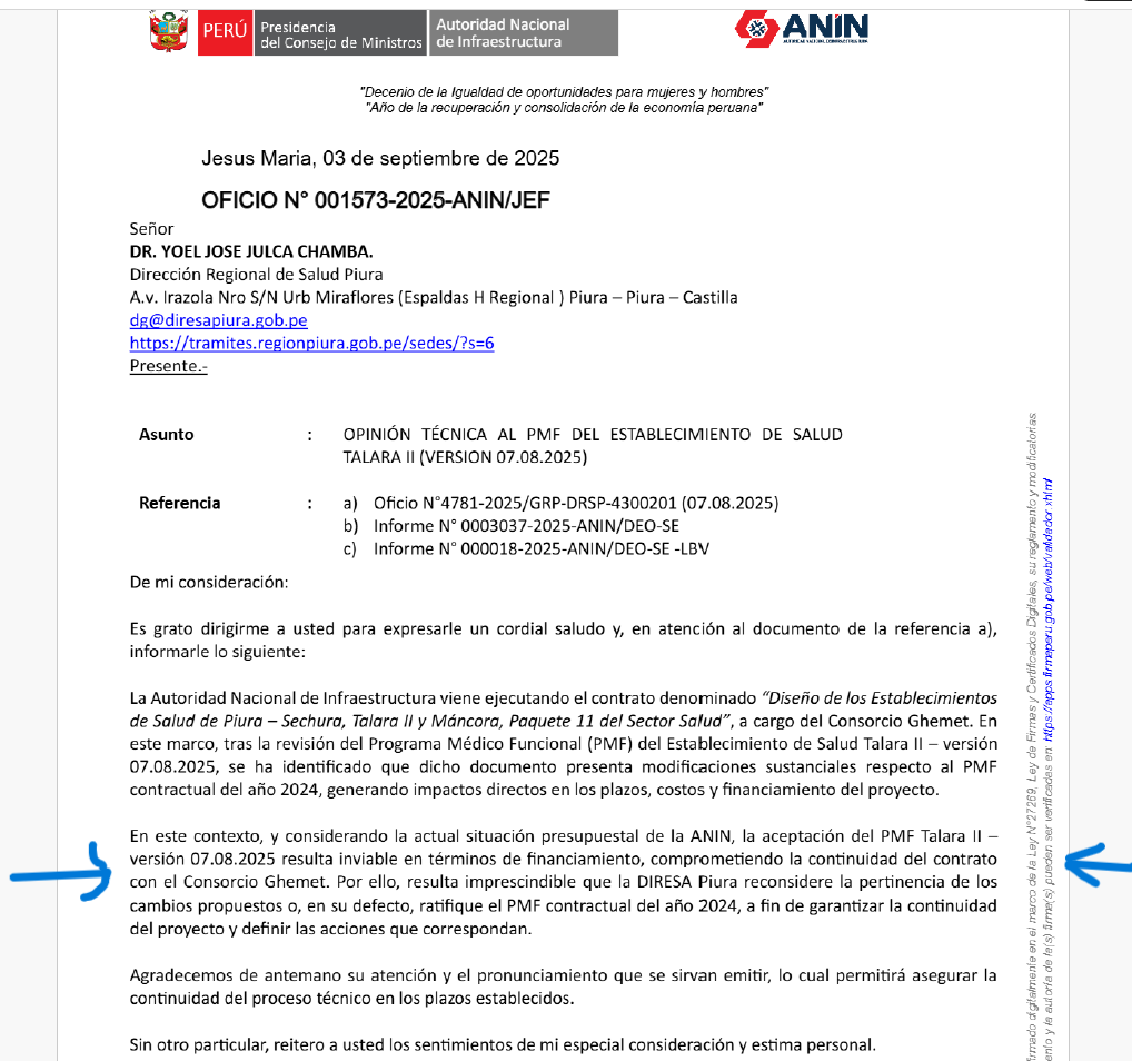 El documento añade que, “… considerando la actual situación presupuestal de la ANIN, la aceptación del PMF Talara II – versión 07.08.2025 resulta inviable en términos de financiamiento, comprometiendo la continuidad del contrato con el consorcio Ghemet. Por ello, resulta imprescindible que la DIRESA Piura reconsidere la pertinencia de los cambios propuestos o, en su defecto, ratifique el PMF contractual del año 2024, a fin de garantizar la continuidad del proyecto y definir las acciones que correspondan”.