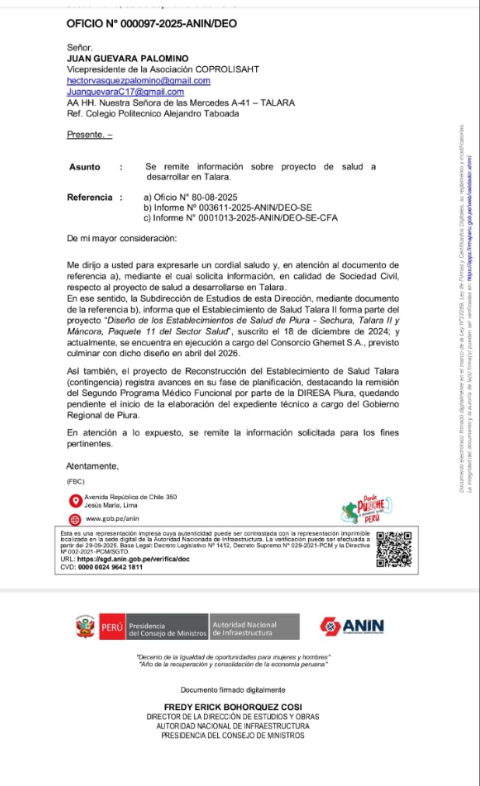 La Autoridad Nacional de Infraestructura (ANIN) entidad adscrita a la Presidencia del Consejo de Ministros (gobierno nacional) acaba de dar respuesta con el informe 001013-2025-ANIN-DEO-SE-CFA al oficio 80-08-2025 (25 agosto) de la Coordinadora Provincial de Presidentes y Líderes Sociales de Asentamientos Humanos y Distritos de Talara (Coprolisaht) donde le solicita el estado situacional de los dos proyectos que ANIN ejecutaría en Talara: hospital en Enace y reconstrucción del centro de salud Carlos Vivanco.