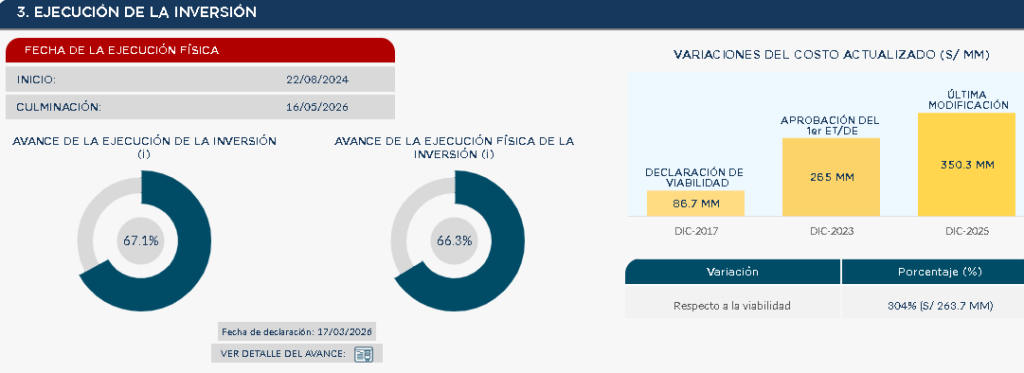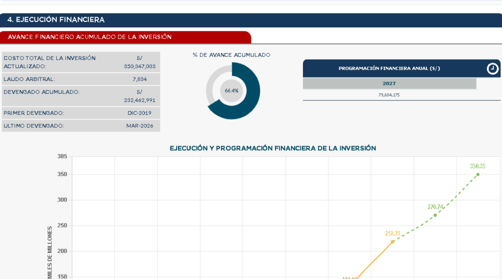 Según información del sistema de seguimiento de las inversiones del ministerio de economía y finanzas (MEF), la obra de más de 75 kilómetros tiene un costo actualizado de 346 millones 978 mil 862.09 Soles registrando un devengado acumulado de S/ 232’462,991.