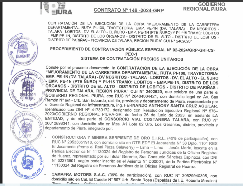 Por otro lado, para la supervisión de obra se contrató consorcio supervisor conformado por KUNA KUNHWA ENGINEERING & CONSULTING CO. LTD SUCURSAL PERU (60% de participaciones) y AZIZE INGENIEROS S.A.C. (40%) con quienes suscribió contrato 154-2024-GRP por el monto de 8 millones 370 mil Soles… Texto: ANDRÉS ABAD TEJADA